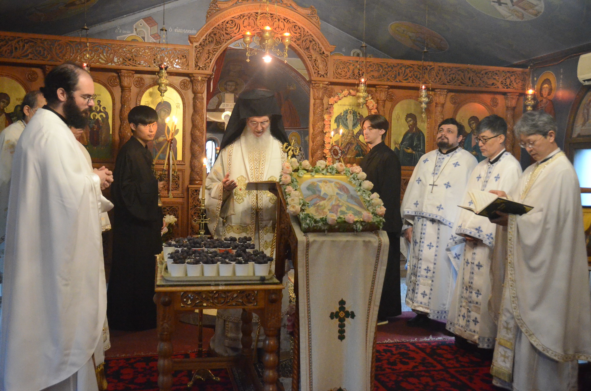 Την παραμονή της εορτής τελέστηκε ο Μεγάλος Εσπερινός μετ᾽ αρτοκλασίας από τον π. Αντώνιο Γου Τζονγκ-χιουν. Την επομένη, κύρια ημέρα της εορτής, τελέστηκε ο Πανηγυρικός Όρθρος και η Θεία Λειτουργία από τον Σεβασμιώτατο Μητροπολίτη, πλαισιούμενο από τους ιερείς π. Ρωμανό Kavchak, π. Αντώνιο Woo, π. Ιερεμία Cho, π. Αντώνιο Lim, π. Επιφάνιο Γρηγοριάτη και π. Ιωάννη Park. Συμμετείχε δε στο εκκλησίασμα και η ομάδα των κατασκηνωτών Λυκείου της κατασκήνωσής μας, μαζί με τα στελέχη. Στο τέλος της λειτουργίας, κατά την τάξη της Εκκλησίας, έγινε η ευλόγηση των σταφυλών, ενώ ακολούθησε το κτιτορικό μνημόσυνο, στην μνήμη του Σεβασμιωτάτου κυρού Σωτηρίου, ο οποίος την σημερινή ημέρα ήγε και τα ονομαστήριά του.