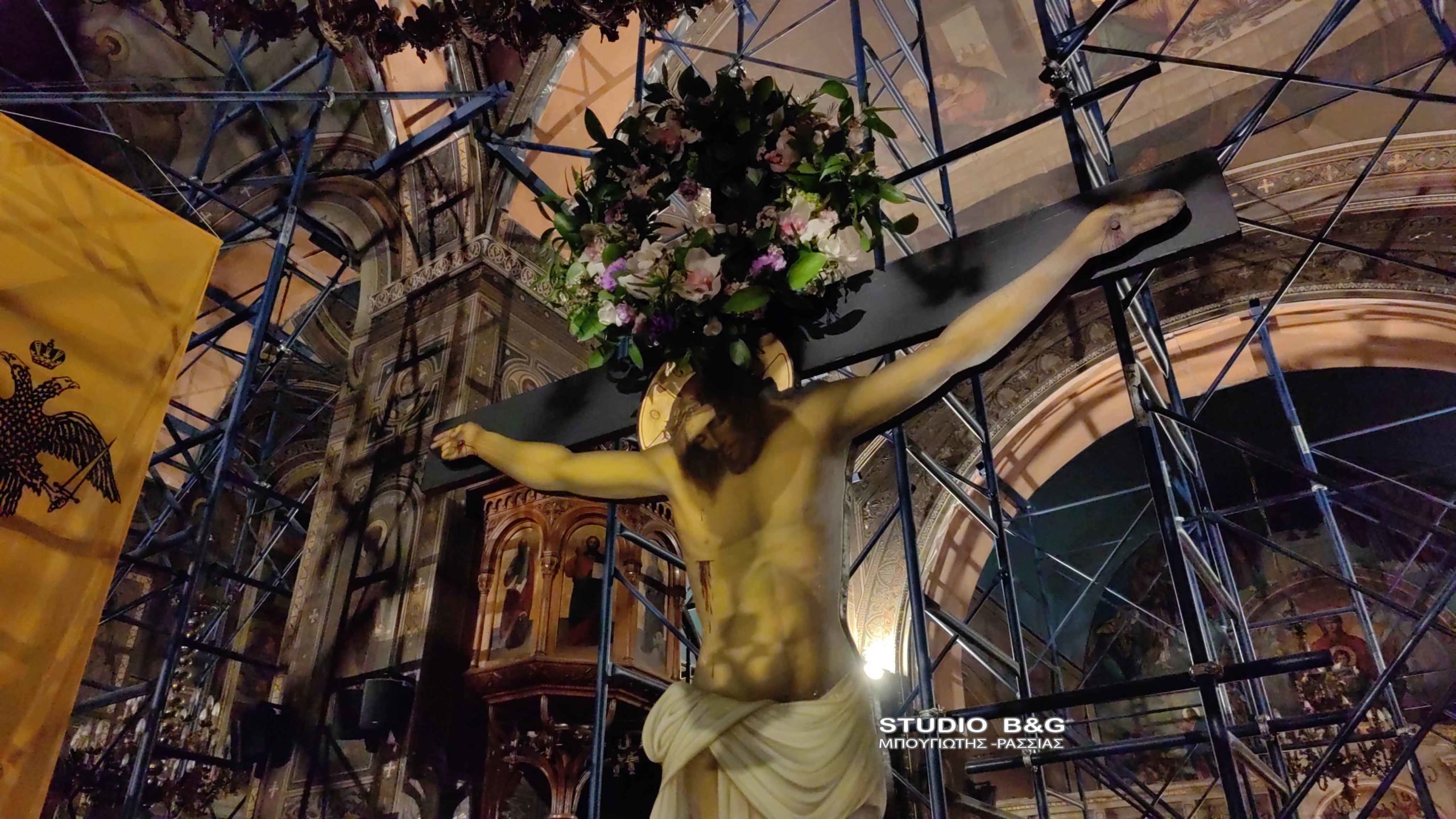 Στον Μητροπολιτικό Ιερό Ναό του Αγίου Γεωργίου στην πόλη του Ναυπλίου σε κατανυκτική ατμόσφαιρα ο Ιερέας του ναού π. Παναγιώτης Κιντής ψάλλοντας το “σήμερον κρεμάται επί ξύλου”, περιέφερε τον εσταυρωμένο και τον τοποθετεί στο κέντρο του Ναού, Μεγάλη Πέμπτη 9 Απριλίου 2026.