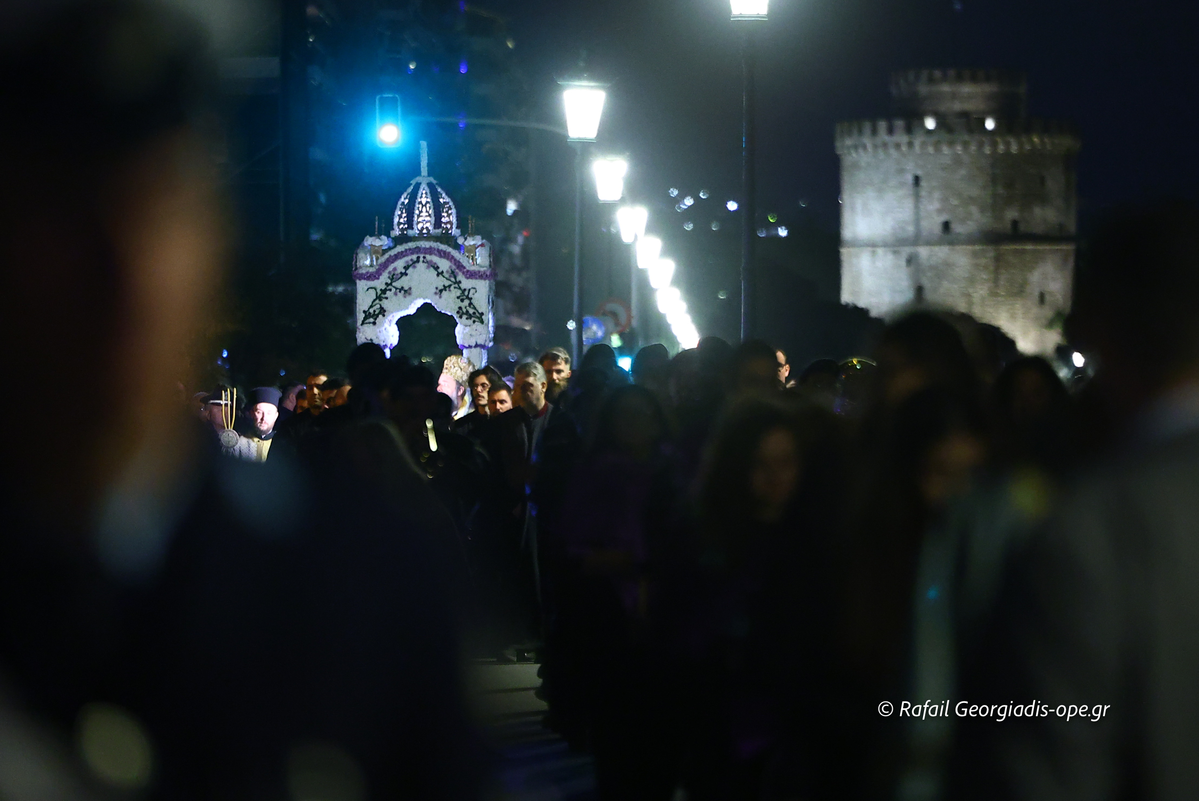 Λίγο μετά τις 21:00 ξεκίνησε η άφιξη των Επιταφίων από ιστορικούς ναούς της πόλης: της Αγίας Σοφίας Θεσσαλονίκης, της Παναγίας Χαλκέων, του Αγίου Νικολάου του Τρανού και της Ιεράς Μονής Αγίας Θεοδώρας. Τελευταίος κατέφθασε ο Επιτάφιος του Μητροπολιτικού Ναού Αγίου Γρηγορίου του Παλαμά, συνοδευόμενος από τη Φιλαρμονική του Στρατού και του Δήμου Θεσσαλονίκης, καθώς και στρατιωτικό άγημα, διασχίζοντας κεντρικούς δρόμους της πόλης.