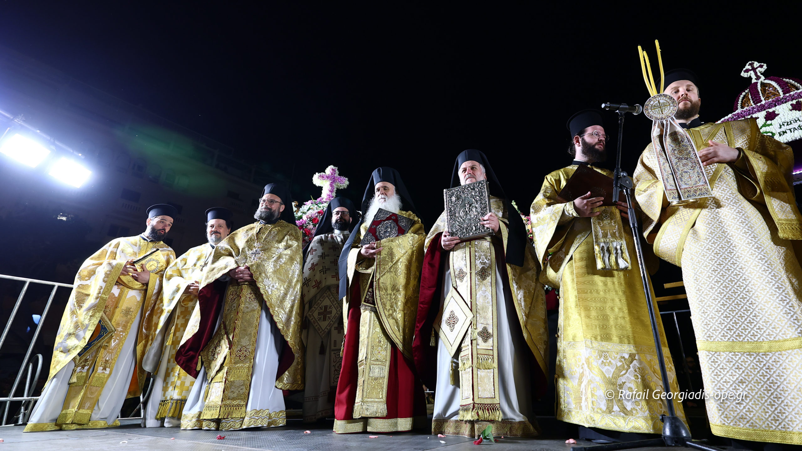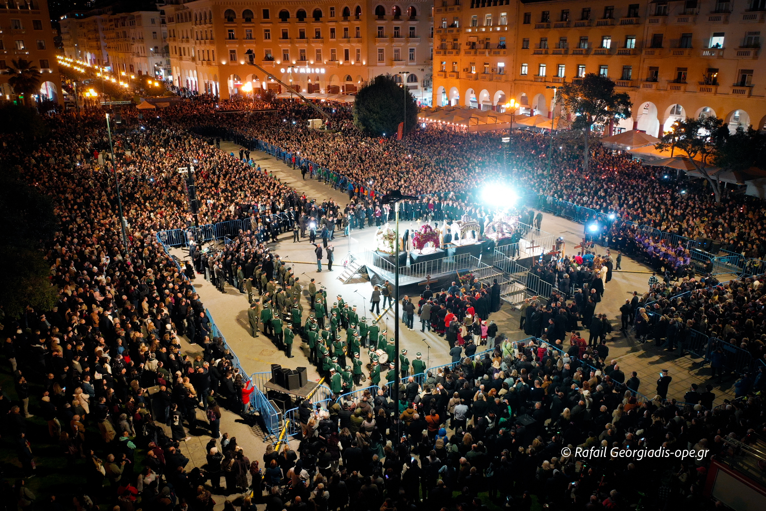 Με ιδιαίτερη κατάνυξη και σε κλίμα βαθιάς συγκίνησης πραγματοποιήθηκε για τρίτη συνεχόμενη χρονιά η μεγαλειώδης συνάντηση των πέντε Επιταφίων στην Πλατεία Αριστοτέλους, συγκεντρώνοντας πλήθος πιστών από τη Θεσσαλονίκη αλλά και επισκεπτών από κάθε γωνιά της χώρας.
