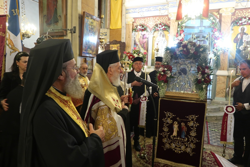 Προ του πέρατος της Ακολουθίας, ο Σεβσσμιώτατος κ. Δωρόθεος Β’ επεσήμανε τον συμβολισμό της ελεύσεως της Αγίας Εικόνος στην Ερμούπολη, η οποία εορτάζει την 200ή επέτειο από την ονοματοδοσία της, υπογράμμισε ότι η προσφυγιά και οι περιπέτειες Εικόνος εκφράζουν τις περιπέτειες και τον πόνο της προσφυγιάς των οικιστών και ιδρυτών Ερμούπολης και τόνισε ότι με παρουσία Της στην Ερμούπολη και τη Σύρο, η Παναγία μας υπενθυμίζει ότι ποτέ δεν θα μας εγκαταλείψει ως άτομα και ως έθνος.