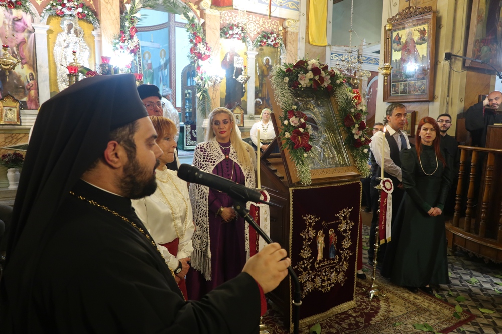 Ο Εσπερινός τελέσθηκε συνευχομένων με τον Σεβασμιώτατο των Εφημερίων του Ναού και Ενοριών της Σύρου και του Αρχιμ. Ραφαήλ Κατακεχαγιά, κομισαμένου εκ από τον Ιερό Ναό Κοιμήσεως της Θεοτόκου, Ταύρου Αθηνών, με την άδεια ευλογία Μακαριωτάτου Αρχιεπισκόπου Αθηνών και Πάσης Ελλάδος κ. Ιερωνύμου Β’, την ιερά και ιστορική Εικόνα της Παναγίας «Ατταλειωτίσσης», και με την παρουσία του Συντονιστή της Αποκεντρωμένης Διοίκησης Αιγαίου κ. Πολυκάρπου Πολυχρονάκη, του Δημάρχου Σύρου-Ερμούπολης κ. Αλέξ. Αθανασίου, του Αντιδημάρχου κ. Δημ. Κοσμά, του Διοικητή της 6ης Περιφέρειας Περιφέρειας Λιμενικού Σώματος, της Λιμενάρχου Σύρου, της εκπροσώπου των Πυροσβεστικών Υπηρεσιών Κυκλάδων, του Υπολιμενάρχη, του εκπροσώπου της Ναυτικής Βάσης Αγκαθωπών, του Προέδρου του Συνδέσμου Των Συριανών κ.Βαφία, της Προέδρου της Αδελφότητας Ανωμεριτών Μυκόνου κας Κουνάνη, του Προέδρου και μελών του Πολιτιστικού Συλλόγου Αναστάσεως-Βροντάδου, της Προέδρου και μελών του Συλλόγου Μικρασιατών με παραδοσιακές στολές και πολλών πιστών.
