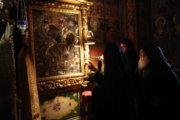 Τότε η Κυρία Θεοτόκος με μεγάλη μητρική παρρησία προς τον Υιό και Θεό Της, πήρε το χεράκι του Χριστού και το κατέβασε από το στόμα Της και κλίνοντας προς τα δεξιά το κεφάλι Της, απέφυγε το χέρι του Χριστού και φώναξε στον Ηγούμενο για δεύτερη φορά· «Μην ανοίξετε σήμερα την πύλη της Μονής, αλλ’ανεβήτε στα τείχη και διώξετε τους πειρατές.» Και «κοιτάξετε να μετανοήσετε, γιατί ο Υιός μου είναι οργισμένος μαζί Σας.» Και επανέλαβε για τρίτη φορά «Σήμερα, μην ανοίξετε την πύλη της Μονής….».