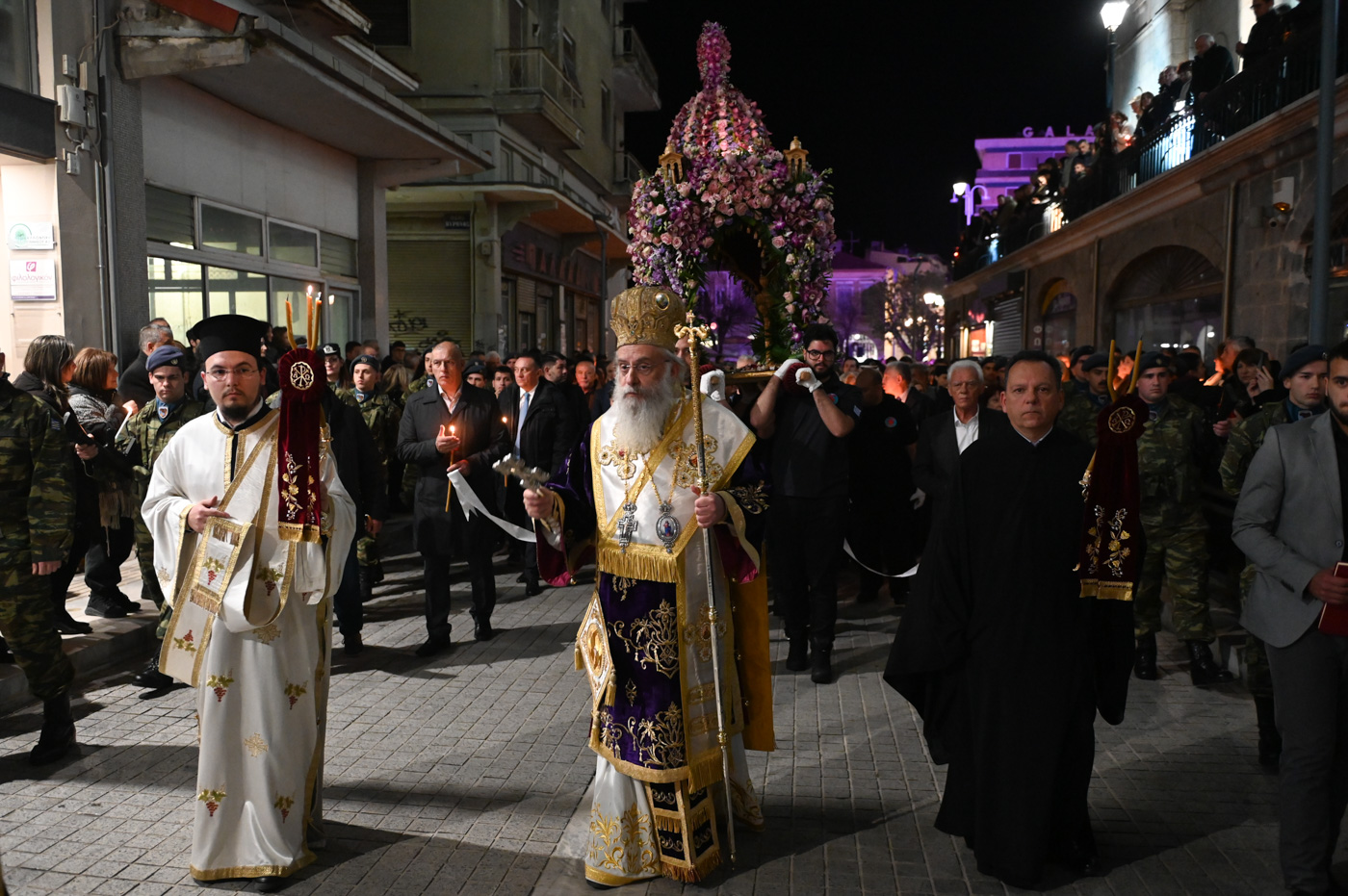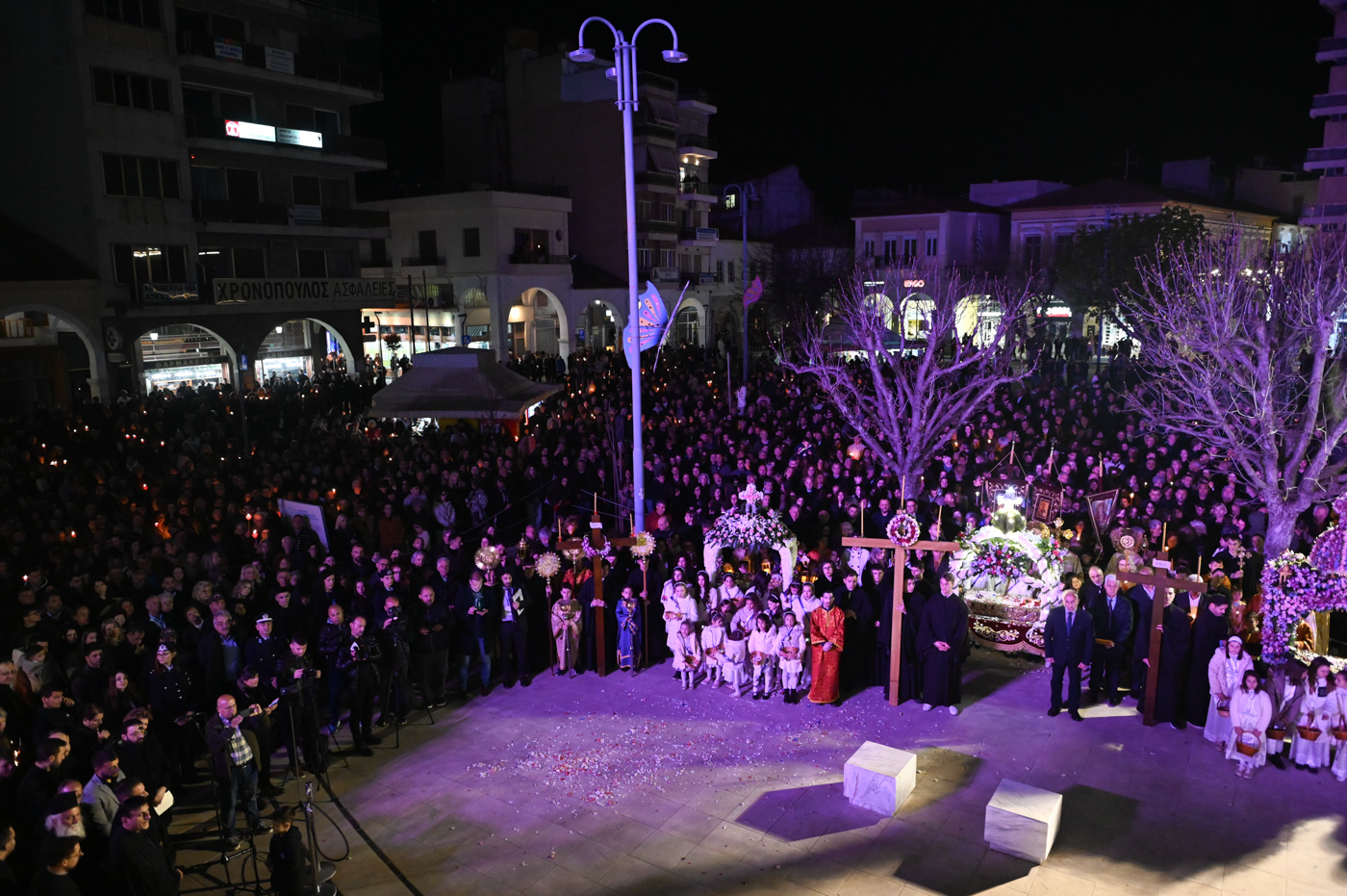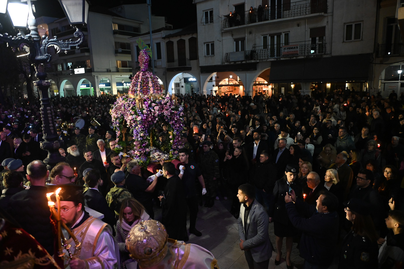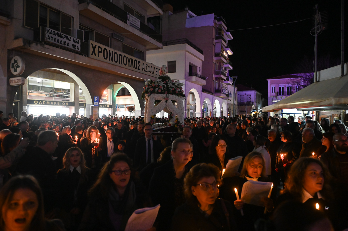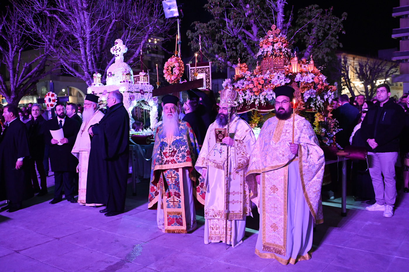 Ακολούθως, τελέσθηκε η περιφορά του Επιταφίου πέριξ του Μητροπολιτικού Ναού, όπου έμπροσθεν αυτού, στην κεντρική πλατεία πραγματοποιήθηκε η συνάντηση των Επιταφίων ενοριών της Τρίπολης. Ο Μητροπολίτης κ. Επιφάνιος, συμπαραστατούμενος από τον Θεοφιλ. Επίσκοπο Τεγέας και από Ιερείς ανέπεμψαν δέηση ενώπιον πλήθους πιστών που κατέκλυσαν την κεντρική πλατεία.