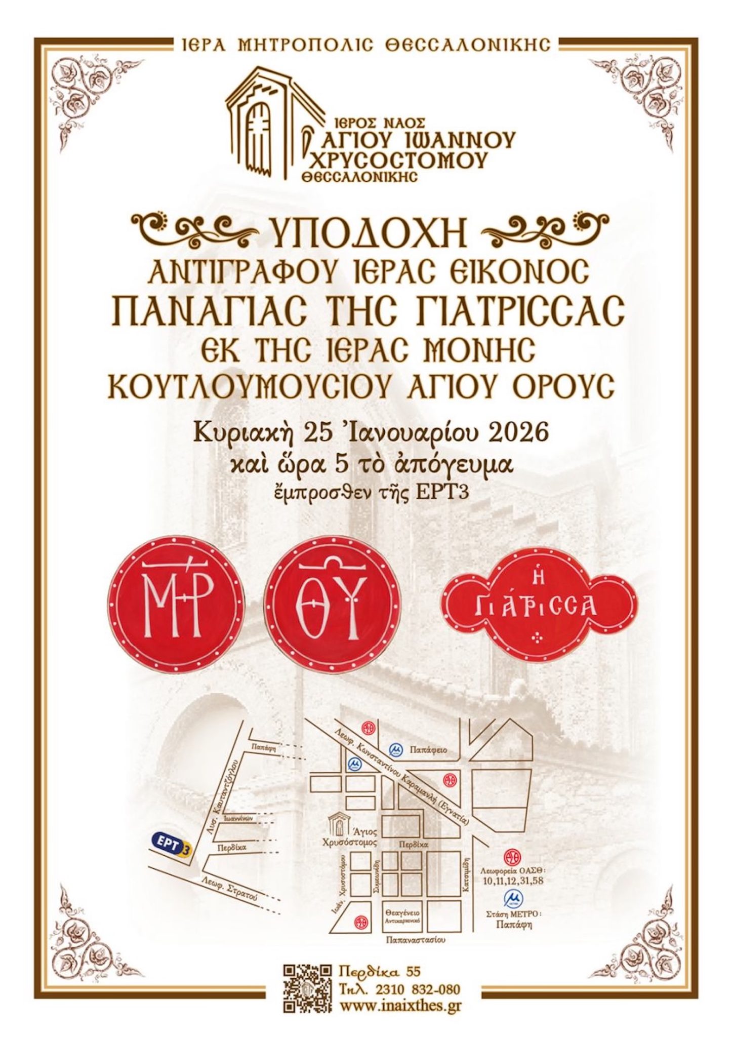 Η επίσημη υποδοχή της ιεράς Εικόνος θα πραγματοποιηθεί, την Κυριακή, 25η Ιανουαρίου 2026, στις 5 :00 μ.μ., στη συμβολή των οδών « Λεωφόρος Στρατού» και « Λυσιμάχου Καυτανζόγλου», έμπροσθεν της ΕΡΤ 3 , απ’ όπου, με λιτανευτική πομπή, η ιερά Εικόνα θα εισοδευθεί στον ιερό Ναό του αγίου Ιωάννου του Χρυσοστόμου.