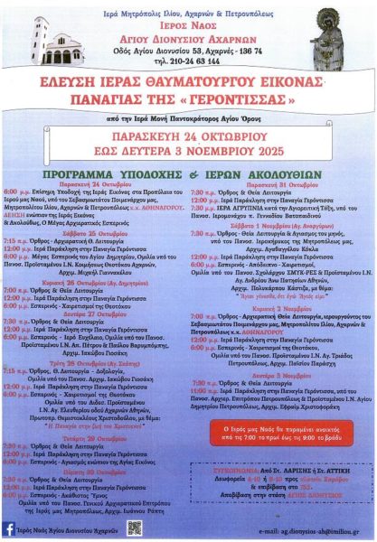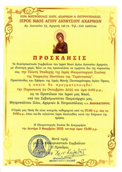 Το Εκκλησιαστικό Συμβούλιο του Ιερού Ναού Αγίου Διονυσίου Αχαρνών με ιδιαίτερη χαρά προσκαλεί στην τελετή υποδοχής της Ιεράς Θαυματουργού Εικόνος της Υπεραγίας Θεοτόκου της «Γερόντισσας», προστάτιδος και εφόρου της Ιεράς Μονής Παντοκράτορος Αγίου Όρους.