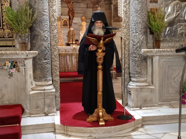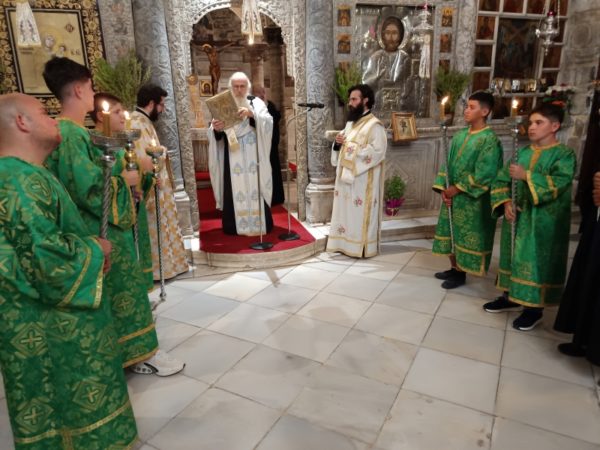 Τον Σεβασμιώτατο Ποιμενάρχη μας πλαισίωσαν ο Ηγούμενος της Ιεράς Μονής Λογγοβάρδας Αρχιμ. Νικόδημος Σαραντόπουλος (ο οποίος και κήρυξε τον θείο λόγο), οι πατέρες του Ιερού Προσκυνήματος, Πρωτοπρ. π. Στυλιανός Μπιζάς (Αντιπρόεδρος της Διοικούσης Επιτροπής του Ι.Π.) και Πρωτοπρ. π. Χρήστος Πετρόπουλος και ο Διάκονος π. Παναγιώτης Κοσμόπουλος.
