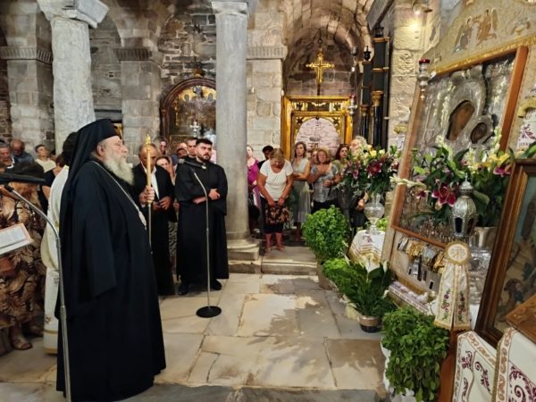 Στο Ιερό Προσκύνημα Παναγίας Εκατονταπυλιανής Πάρου χοροστάτησε στον Εσπερινό και εν συνεχεία στην Ιερά Παράκληση προς την Υπεραγία Θεοτόκο, ο Σεβασμιώτατος Μητροπολίτης Παροναξίας κ. Καλλίνικος, το εσπέρας της Τρίτης 12 Αυγούστου.