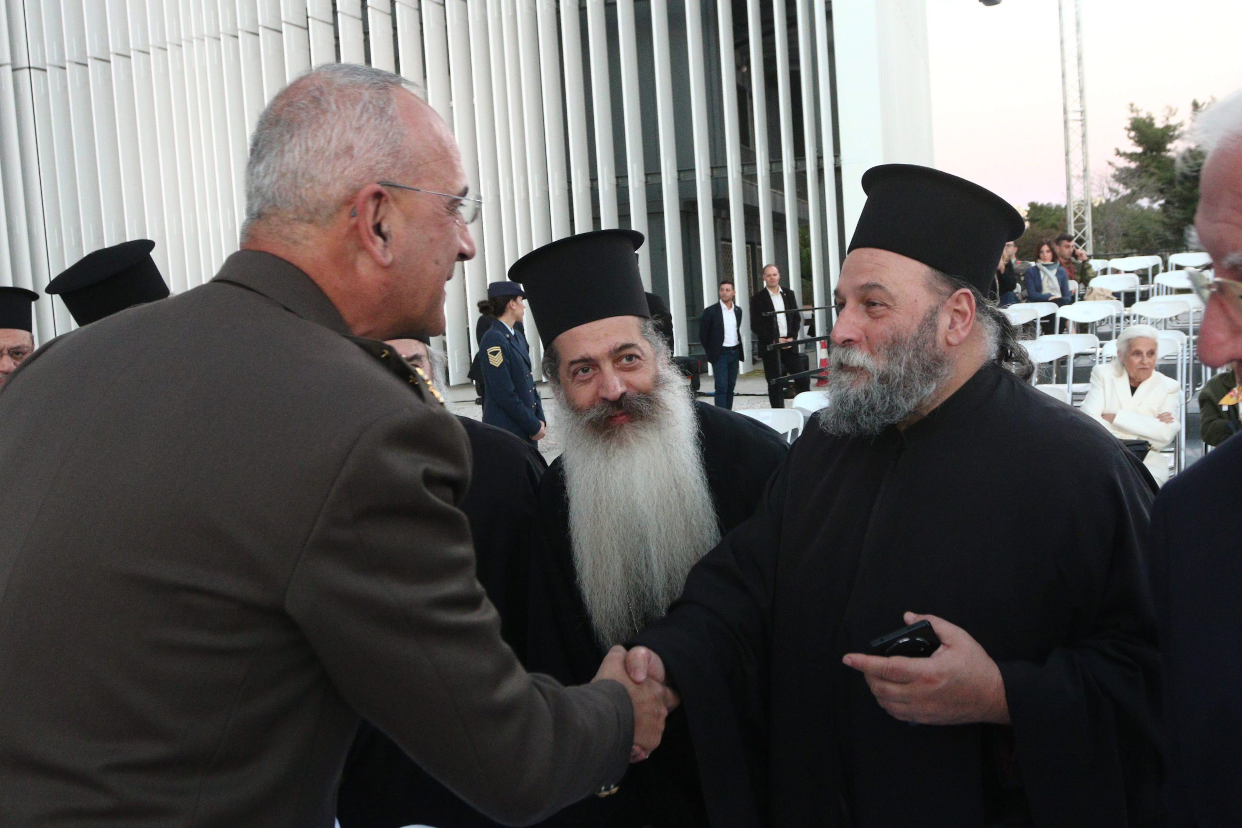Στην τελετή αποκαλυπτηρίων της νέας βιοκλιματικής όψης του κεντρικού κτιρίου του Υπουργείου Εθνικής Άμυνας, που πραγματοποιήθηκε ενώπιον του Πρωθυπουργού Κυριάκου Μητσοτάκη, παρουσία του Προέδρου της Βουλής Νικήτα Κακλαμάνη και του Υπουργού Εθνικής Άμυνας Νίκου Δένδιας, στον περιβάλλοντα χώρο του Στρατοπέδου «Παπάγου», παρέστησαν Ιεράρχες της Εκκλησίας της Ελλάδος.