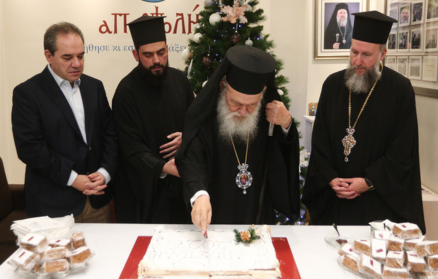 Την πρωτοχρονιάτικη βασιλόπιτα του Φιλανθρωπικού Οργανισμού «Αποστολή», έκοψε σήμερα το μεσημέρι ο Αρχιεπίσκοπος Αθηνών και πάσης Ελλάδος κ.κ.Ιερώνυμος συνοδευόμενος από τον Γενικό Αρχιερατικό Επίτροπο της Ιεράς Αρχιεπισκοπής Αθηνών, Αιδεσιμολογιώτατο Πρωτοπρεσβύτερο π. Εμμανουήλ Παπαμικρούλη και τον Αρχιδιάκονο π. Δημήτριο Φωκιανό. Τον Μακαριώτατο υποδέχτηκε ο Γενικός Διευθυντής της «Αποστολής» κ. Κωνσταντίνος Δήμτσας με συνεργάτες και το προσωπικό, ενώ παρέστη και ο Αντιπρύτανης Διοικητικών Υποθέσεων, Φοιτητικής Μέριμνας και Δια Βίου Μάθησης του ΕΚΠΑ, Καθηγητής κ. Χρήστος Καραγιάννης.