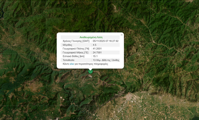 Σεισμός μεγέθους 4,5 Ρίχτερ σημειώθηκε το πρωί της Τετάρτης (11/05) 13 χιλιόμετρα δυτικά της Ξάνθης.