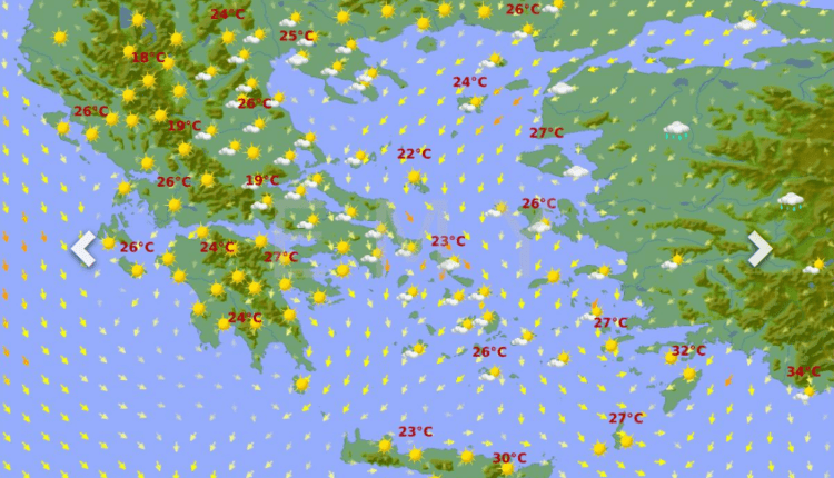Θερμοκρασία: Από 19 έως 30 και τοπικα στην Κρήτη έως 32 βαθμούς Κελσίου.
