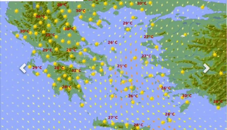 Θερμοκρασία: Από 25 έως 33 με 35 και στη νότια Κρήτη έως 36 με 38 βαθμούς Κελσίου.