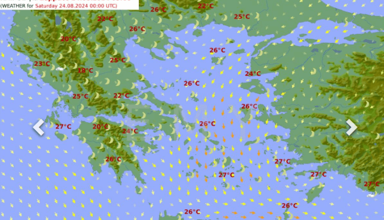 Θερμοκρασία: Από 24 έως 32 και στη νότια Κρήτη έως 36 βαθμούς Κελσίου.