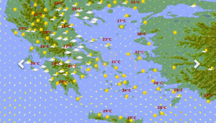 Θερμοκρασία: Από 19 έως 33 και στην Κρήτη τοπικά έως 35 με 36 βαθμούς Κελσίου.