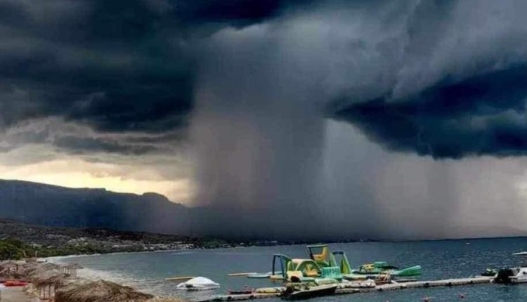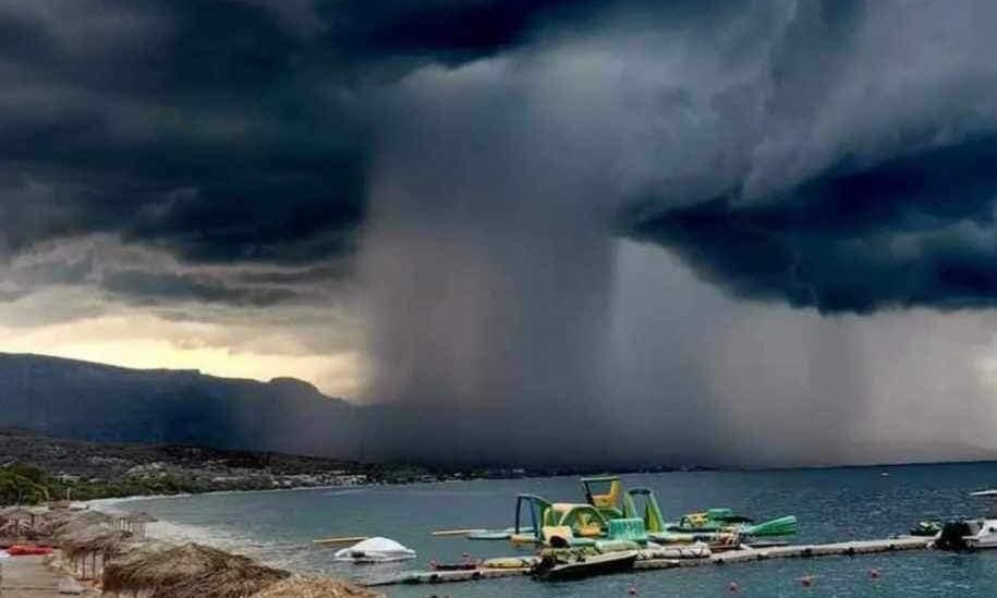 Όπως θα δείτε στην φωτογραφία που αναρτήθηκε στα social media, φαίνονται τεράστια σύννεφα να έχουν σκεπάσει την παραλία των Αγίων Θεοδώρων σχηματίζοντας έτσι έναν «καταρράκτη» νερού.
