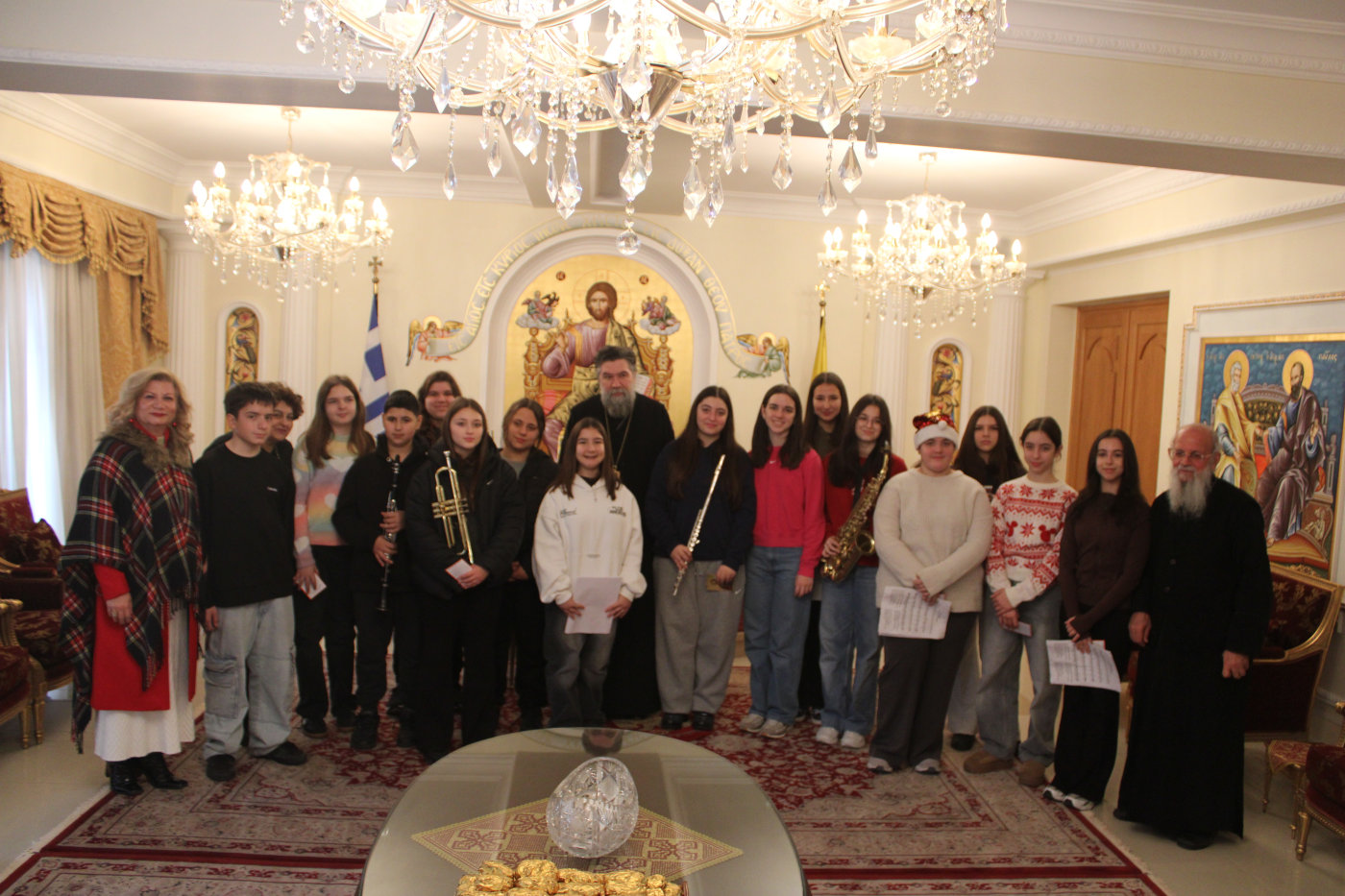 Μετά την μελωδική απόδοση των εορτίων ακουσμάτων από τα παιδιά, ο Σεβασμιώτατος ευχήθηκε πατρικώς την εξ ύψους ευλογία, δύναμη και φωτισμό στην Διευθύντρια κ. Χρύσα Παλάζη, την συνοδό εκπαιδευτικό κ. Αικατερίνη Βλαδίκα και την λοιπή εκπαιδευτική κοινότητα, υγεία και πρόοδο στους μαθητές και τις μαθήτριες του Μουσικού Σχολείου, το οποίο, όπως χαρακτηριστικώς τόνισε, κατέχει σπουδαία θέση ανάμεσα στα μουσικά Σχολεία της Πατρίδος μας.