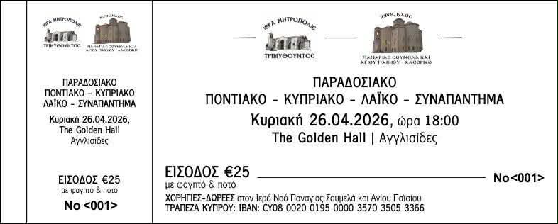 Με τις ευλογίες του Πανιερωτάτου Μητροπολίτου Τριμυθούντος κ. Βαρνάβα, η Εκκλησιαστική Επιτροπή του Ιερού Ναού μαζί με ομάδα εθελοντών διοργανώνει καλλιτεχνική βραδιά-συνεστίαση στο Golden Hall στις Αγγλισίδες, την Κυριακή 26 Απριλίου και ώρα 18:00.