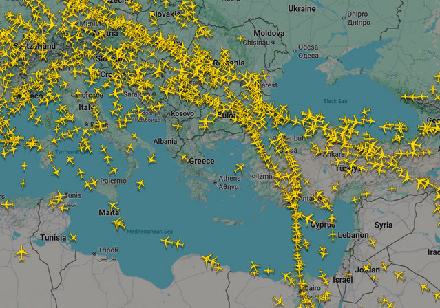 H εικόνα του Flight Radar, της εφαρμογής που παρακολουθεί σε ζωντανό χρόνο όλες τις πτήσεις που πραγματοποιούνται στον κόσμο, δείχνει ήδη τα πρώτα αεροσκάφη να πετούν πάνω από την Ελλάδα λίγο μετά τις 13:00