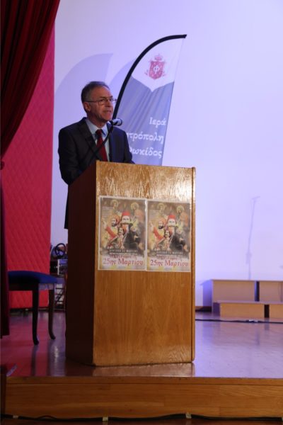 • Κεντρικός πανηγυρικός λόγος από τον εκπαιδευτικό κ. Δημήτριο Παλούκη, με αναφορές στη σύνδεση Πίστης και Ελευθερίας.