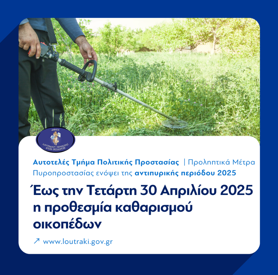Στο πλαίσιο των προληπτικών μέτρων πυροπροστασίας ενόψει της αντιπυρικής περιόδου 2025 σας γνωρίζουμε ότι σύμφωνα με την 20/2024 Πυροσβεστική Διάταξη (ΦΕΚ2695/τ.Β΄/09.05.2024), οι ιδιοκτήτες, νομείς και επικαρπωτές μισθωτές και υπομισθωτές των οικοπέδων και λοιπών ακάλυπτων χώρων, υποχρεούνται όπως μεριμνήσουν για τον καθαρισμό των ιδιοκτησιών τους προς αποτροπή κινδύνου πρόκλησης πυρκαγιάς ή ταχείας επέκτασής της, έως την Τετάρτη 30 Απριλίου 2025.