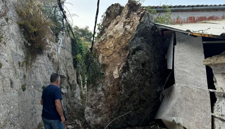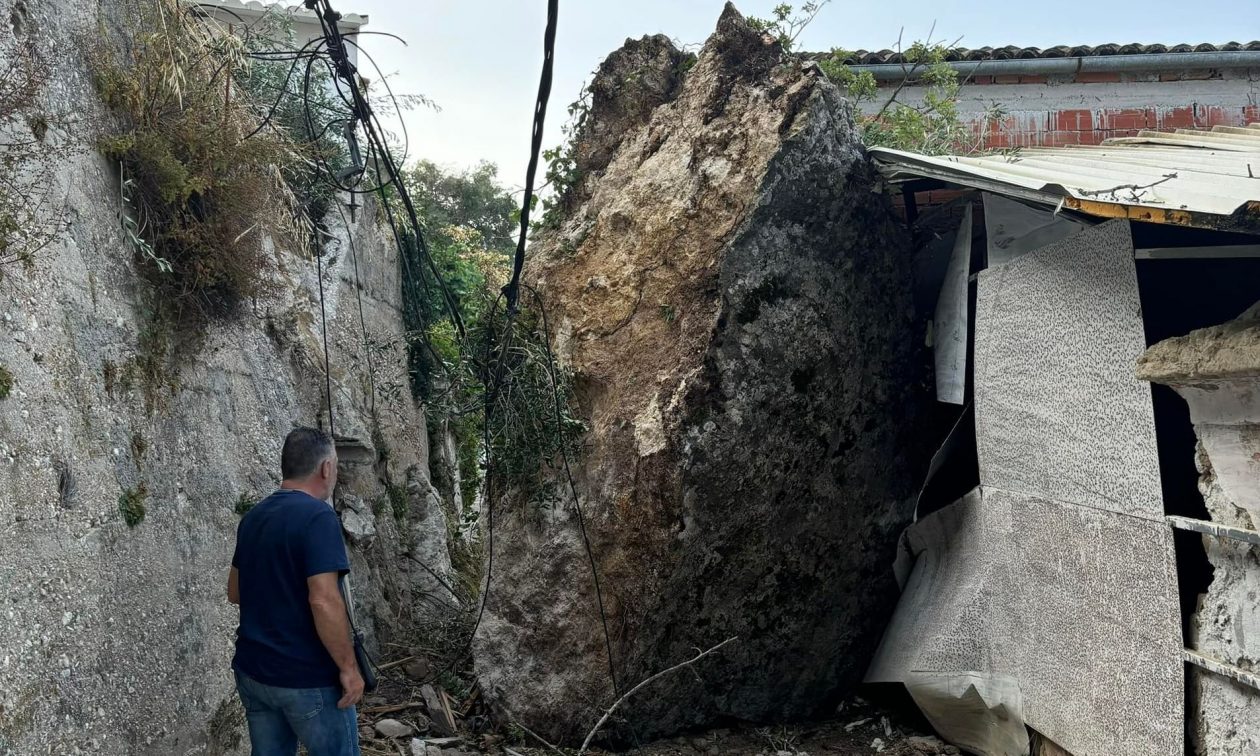 Μεγάλος βράχος αποκολλήθηκε από την πλαγιά του βουνού, σήμερα το πρωί και έπεσε στον κεντρικό δρόμο μέσα στο χωριό του Άνω Γαρούνα, Κέρκυρας.