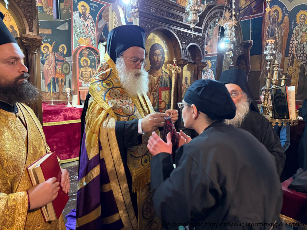 Επίσης, ο Σεβ. κ. Κύριλλος ευχήθηκε εγκάρδια στη νέα Μοναχή να καλλιεργήσει σε βάθος τις μοναχικές αρετές της υπακοής, της ακτημοσύνης και της παρθενίας, να «τελειώσει καλώς» το μοναχικό σχήμα, αισθανόμενη διαρκώς ότι «ο μοναχός είναι υποκάτω πάσης της κτίσεως» και να μοιάσει στις παλαιές μοναχές της Κρήτης, οι οποίες διακρίνονταν από την απλότητα, το ταπεινό φρόνημα, την προσευχή και την αφειδώλευτη αγάπη προς τον Θεό και τον άνθρωπο.