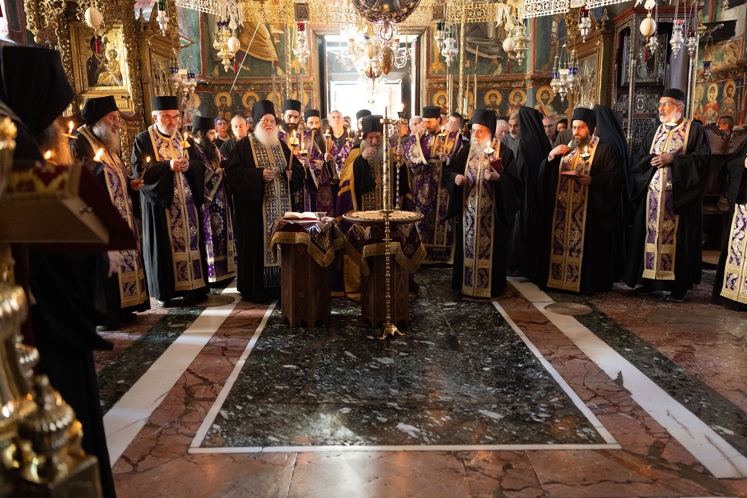 Της Ιεράς Ακολουθίας του Μεθεορτίου Εσπερινού και του Μνημοσύνου προεξήρχε ο Καθηγούμενος Ι.Μ. Σίμωνος Πέτρας Γέρων Ελισαίος, ο οποίος προσήλθε με πατέρες της Μονής πλαισιούμενος από τον Καθηγούμενο της Ι.Μ.Μ Βατοπαιδίου Γέροντα Εφραίμ και άλλους πατέρες.