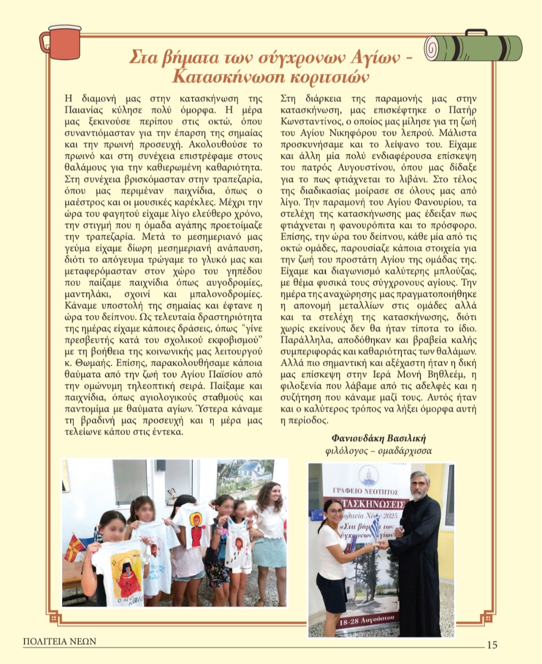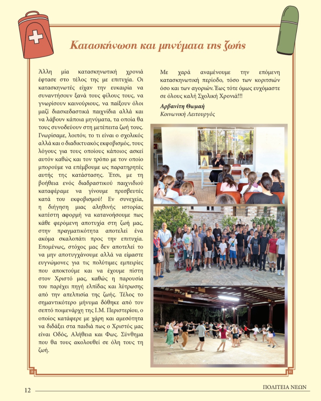 Το πρώτο τεύχος του Περιοδικού Οκτωβρίου 2025 είναι αφιερωμένο στην Κατασκήνωση τόσο των αγοριών όσο και κοριτσιών Δημοτικού, Γυμνασίου, Λυκείου, όπου έλαβε χώρα σε δύο θερινές περιόδους στην Παιανία στο «Πειραϊκό Χωριό» Ιεράς Μητροπόλεως Πειραιώς.