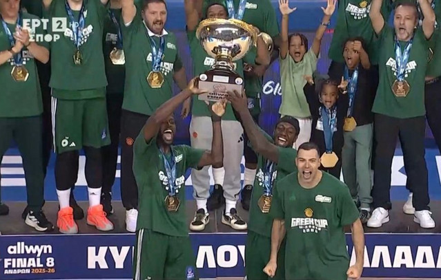 Ο Παναθηναϊκός κατέκτησε το κύπελλο Ελλάδας μπάσκετ για 22η φορά στην ιστορία του, με τον Βαγγέλη Λιόλιο να κάνει την απονομή του τροπαίου και τον Κώστα Σλούκα να πανηγυρίζει έξαλλα με τους οπαδούς της ομάδας του.