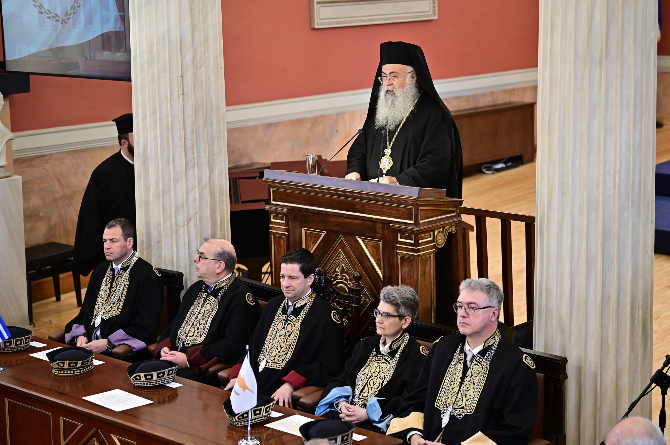Tην ειλικρινή και διαχρονική ευγνωμοσύνη του προς το Εθνικό και Καποδιστριακό Πανεπιστήμιο Αθηνών για τη σταθερή του στάση και τη μακροχρόνια προσφορά του στην εθνική και πνευματική επιβίωση και πρόοδο της Κύπρου, εξέφρασε σήμερα ο Αρχιεπίσκοπος Κύπρου κ.κ. Γεώργιος από το βήμα του αρχαιότερου Πανεπιστημιακού Ιδρύματος της Ελλάδας.