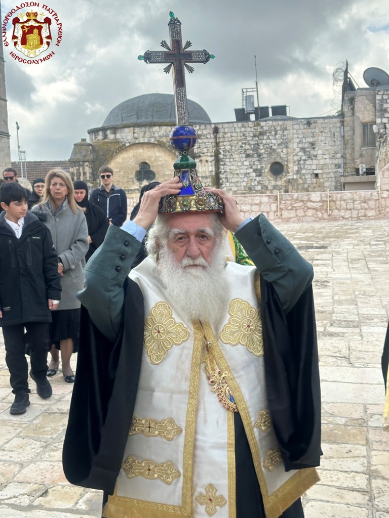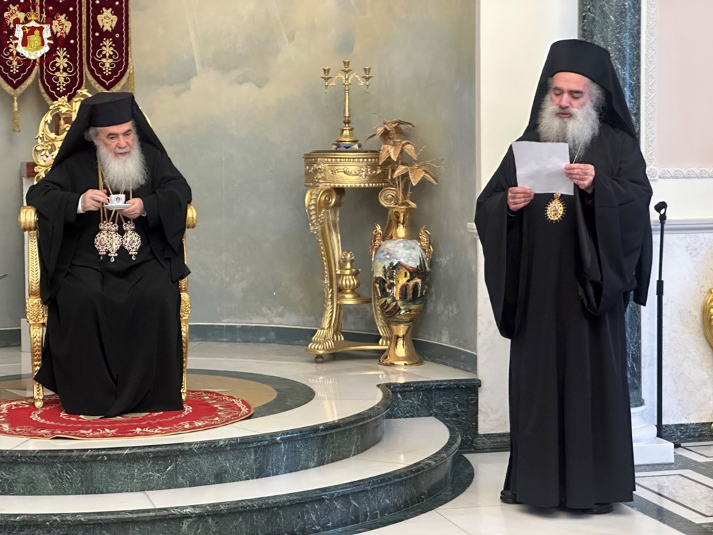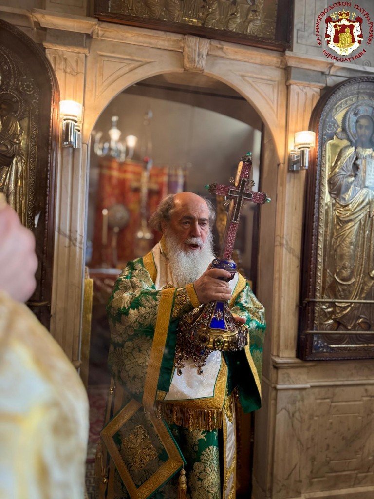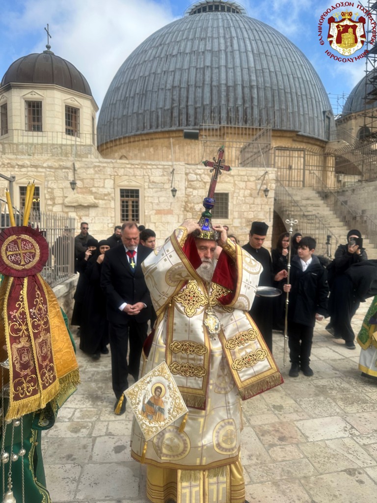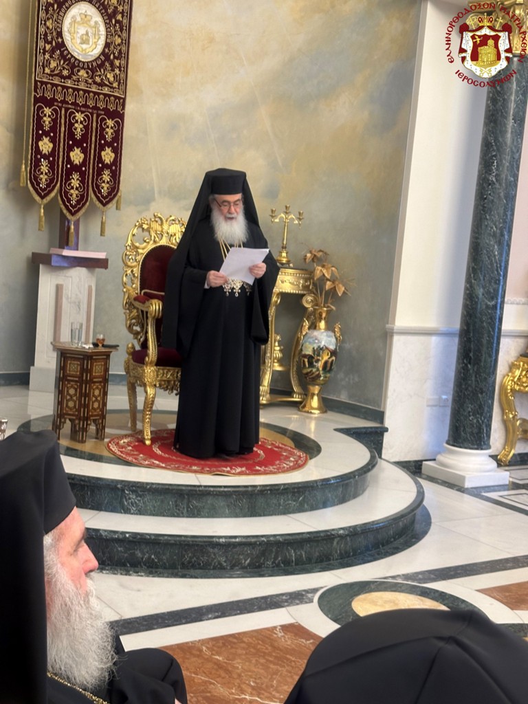 Διὸ καὶ Ἡμεῖς, μὴ δυνηθέντες κατελθεῖν εἰς τὸν Πανίερον Ναὸν τῆς Ἀναστάσεως ἕνεκεν τῆς κυριαρχούσης πολεμικῆς κρίσεως, μετέβημεν εἰς τὸν Πατριαρχικὸν καὶ Μοναστηριακὸν Ναὸν τῶν Ἁγίων Ἐνδόξων καὶ Θεοστέπτων Βασιλέων καὶ Ἰσαποστόλων Κωνσταντίνου καὶ Ἑλένης, ἔνθα ἐτελέσαμεν μετὰ παρρησίας Θείαν Πατριαρχικὴν Λειτουργίαν συλλειτουργούντων Ἡμῖν τιμίων μελῶν, Ἀρχιερέων, Ἱερέων καὶ Ἱεροδιακόνων τῆς Ἁγιοταφιτικῆς ἡμῶν Ἀδελφότητος.