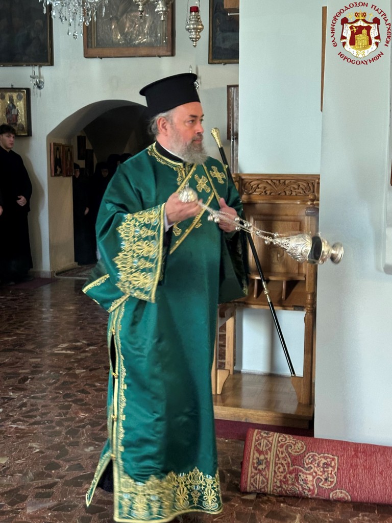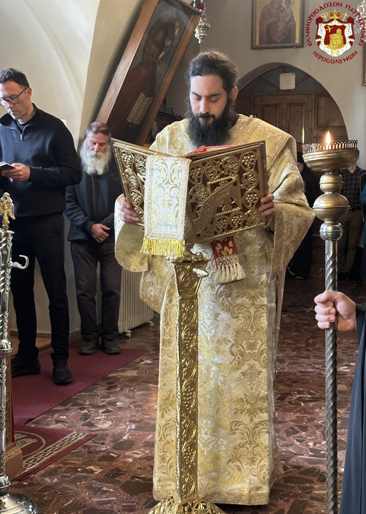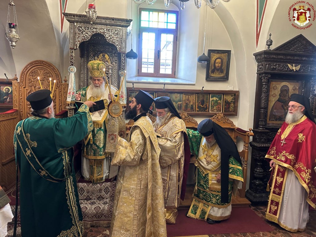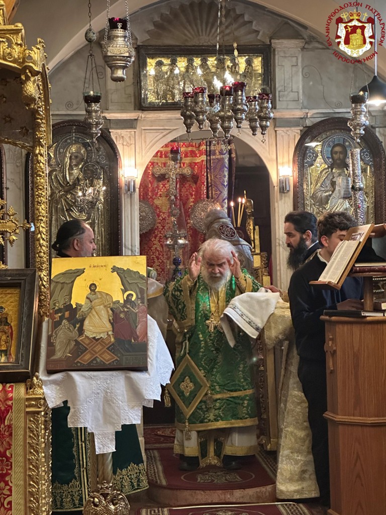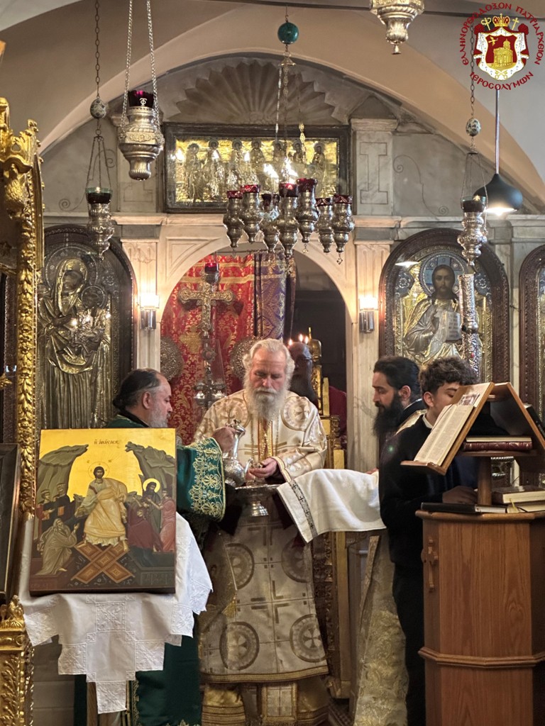 Διὸ καὶ Ἡμεῖς, μὴ δυνηθέντες κατελθεῖν εἰς τὸν Πανίερον Ναὸν τῆς Ἀναστάσεως ἕνεκεν τῆς κυριαρχούσης πολεμικῆς κρίσεως, μετέβημεν εἰς τὸν Πατριαρχικὸν καὶ Μοναστηριακὸν Ναὸν τῶν Ἁγίων Ἐνδόξων καὶ Θεοστέπτων Βασιλέων καὶ Ἰσαποστόλων Κωνσταντίνου καὶ Ἑλένης, ἔνθα ἐτελέσαμεν μετὰ παρρησίας Θείαν Πατριαρχικὴν Λειτουργίαν συλλειτουργούντων Ἡμῖν τιμίων μελῶν, Ἀρχιερέων, Ἱερέων καὶ Ἱεροδιακόνων τῆς Ἁγιοταφιτικῆς ἡμῶν Ἀδελφότητος.