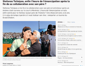 «Ο Στέφανος Τσιτσιπάς έλυσε τη συνεργασία με τον πατέρα και προπονητή του μετά από μια ακόμη σύγκρουση στο γήπεδο του Μόντρεαλ. Ήρθε επιτέλους η ώρα της απελευθέρωσης για τον καλύτερο Έλληνα τενίστα της ιστορίας; Ένα είναι σίγουρο, στα 26 του δεν έχει χρόνο για χάσιμο» γράφει η «Equipe», «αν θέλει να πραγματοποιήσει το όνειρό του: να κερδίσει ένα τουρνουά Grand Slam».