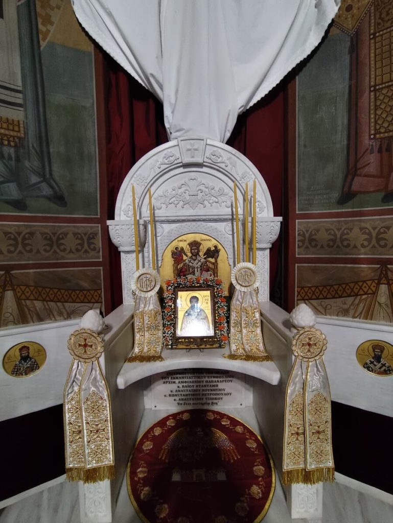 Την τιμία κάρα υποδέχθηκε ο Σεβασμιώτατος Μητροπολίτης Λήμνου και Αγίου Ευστρατίου κ. Ιερόθεος, ενώ στη συνέχεια η λιτανευτική πομπή κατέληξε στον Μητροπολιτικό Ιερό Ναό Αγίων Κωνσταντίνου και Ελένης, όπου τελέσθηκε ο πανηγυρικός Εσπερινός, χοροστατούντος του ιδίου.