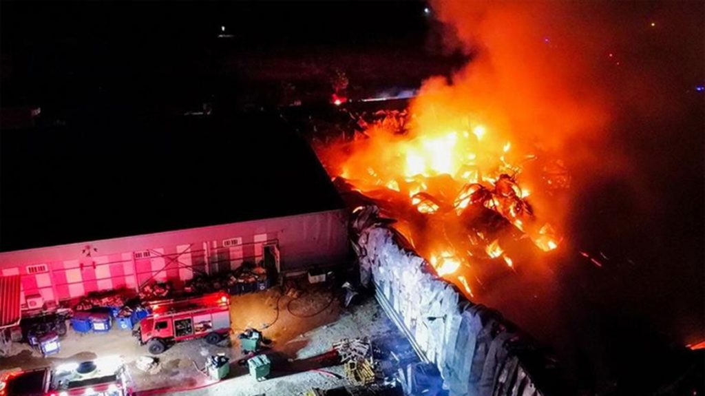 Παράλληλα, δυνάμεις της Πυροσβεστικής βρίσκονται για δεύτερο 24ωρο στο εργοστάσιο της εταιρείας -που τυλίχθηκε στις φλόγες το επόμενο βράδυ του συμβάντος- και προχωρούν σε ρίψη νερού, αφού ο καπνός είναι ακόμα έντονος ενώ υπάρχει άμεσος κίνδυνος ολικής κατάρρευσης.
