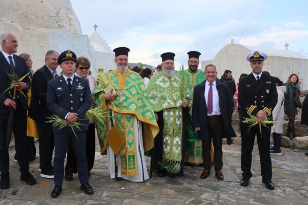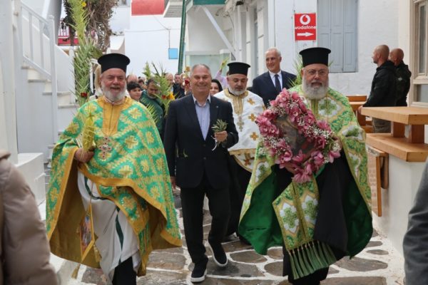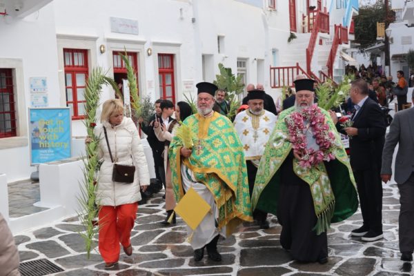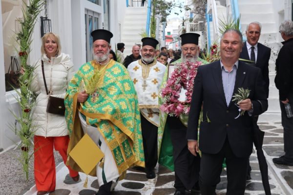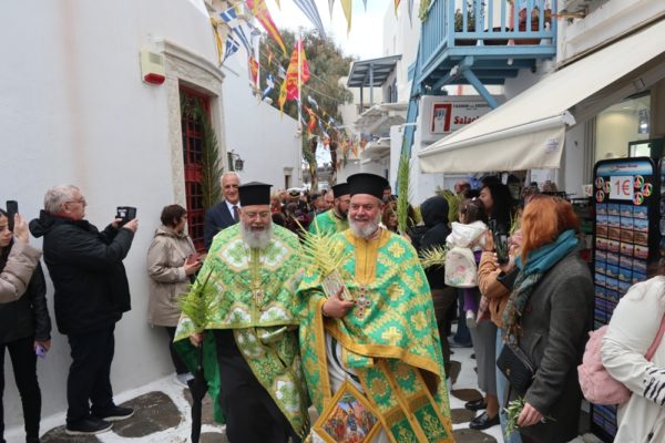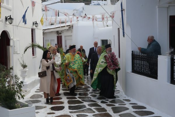 Εν συνεχεία, ακολούθησε η λαμπρά λιτανευτική πομπή της Βαϊοφόρου, από τον ιστορικό Ναό της Αχειροποιήτου Παραπορτιανής και τον πάλαι ποτέ Μητροπολιτικό Ναό της Αγίας Βασιλομήτορος Ελένης, στην παραλία και τα γραφικά δρομάκια της Μυκόνου, την οποία ακολούθησε πλήθος πιστών Μυκονίων, μεταξύ των οποίων η Βουλευτής Κυκλάδων της Νέας Δημοκρατίας κα Αικατερίνη Μονογυιού, ο Δήμαρχος Μύκονου κ. Χρήστος Βερώνης, Περιφερειακοί και Δημοτικοί Σύμβουλοι, εκπρόσωποι τοπικών Αρχών και Υπηρεσιών και ο Πρόεδρος του Σωματείου «Μυκονιάτικη Αλληλεγγύη».