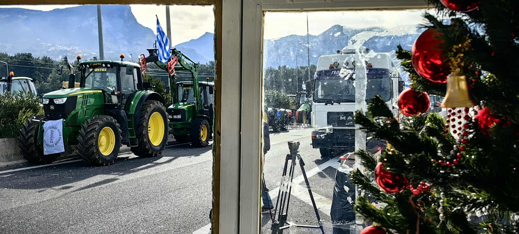 Αγρότες από το μπλόκα του Ερυμάνθου και των Καλαβρύτων ενισχύουν το μπλόκο στον κόμβο της Εγλυκάδας στήνοντας ένα μικρό χριστουγεννιάτικο δέντρο για να δηλώσουν, ότι θα κάνουν Χριστούγεννα στους δρόμους, αλλά και Πρωτοχρονιά αν χρειαστεί.