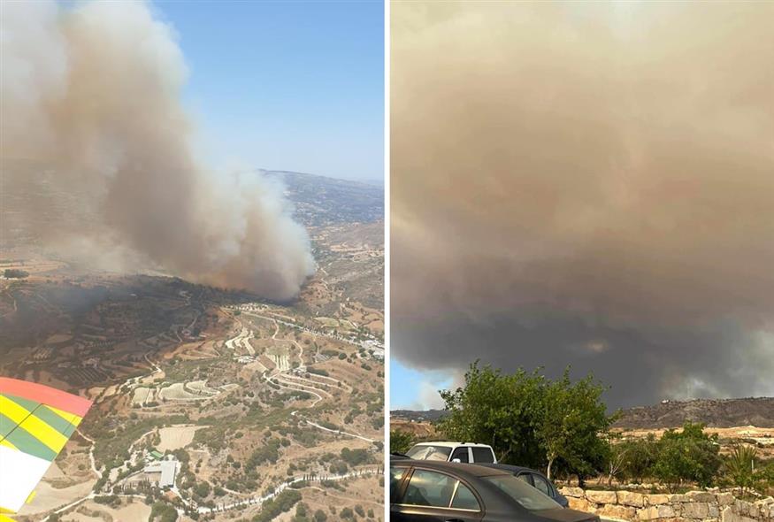 Μεγάλη φωτιά βρίσκεται σε εξέλιξη στην επαρχία Πάφου, ανατολικά της κοινότητας Γιόλου στην Κύπρο. H φωτιά κατευθύνεται επικίνδυνα προς το χωριό Άγιος Δημητριανός.