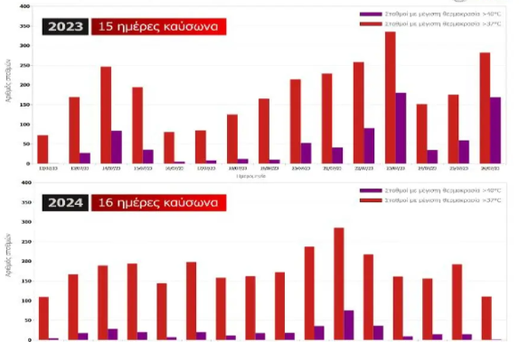 Στον καύσωνα του 2024 ο αριθμός σταθμών με μέγιστη θερμοκρασία από 37 °C και πάνω δεν έπεσε ποτέ κάτω των 100 για 16 συνεχόμενες ημέρες. Σε αντίθεση με τον καύσωνα του 2023 όπου ο αριθμός των σταθμών με μέγιστη θερμοκρασία από 37 °C και πάνω, έπεσε κάτω από τους 100 για 3 φορές μέσα στο διάστημα των 15 ημερών.