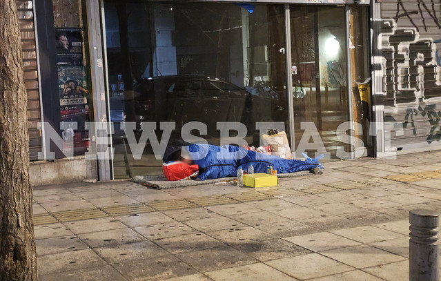 Η κάμερα του Newsbeast στην Ιπποκράτους συνάντησε δύο ανθρώπους που είχαν στήσει τα αυτοσχέδια κρεβάτια τους στο πεζοδρόμιο. Μια γυναίκα έξω από ένα βιβλιοπωλείο είχε «παραδοθεί» στην αγκαλιά του Μορφέα και δεν κατάλαβε την παρουσία μας. Πέντε έξι μέτρα πιο κάτω, ένας άντρας είχε στήσει το δικό του σπιτικό χρησιμοποιώντας χαρτόκουτα. Διακρίναμε το σκουφάκι του από το κεφάλι του, όπως ήταν καθισμένος προσπαθώντας να προφυλαχθεί από το κρύο.