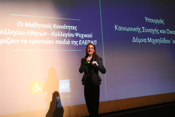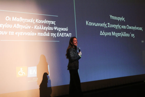 Στη συνέχεια, η Δωριάννα Κονιδάρη, μαθήτρια της Γ’ Λυκείου του Κολλεγίου Αθηνών και πρωτοπόρος στην πρωτοβουλία στήριξης των παιδιών της ΕΛΕΠΑΠ, τόνισε ότι κάθε χρόνο στις 3 Δεκεμβρίου εορτάζεται η Παγκόσμια Ημέρα Ατόμων με Αναπηρία. Φέτος, είπε, οι μαθητές και μαθήτριες των Γυμνασίων και των Λυκείων του Κολλεγίου Αθηνών και του Κολλεγίου Ψυχικού ανέλαβαν μια διαφορετική πρωτοβουλία: να στηρίξουν τα «γενναία παιδιά» της ΕΛΕΠΑΠ και να τους δώσουν τη δυνατότητα να κάνουν τα δικά τους «βήματα ζωής».