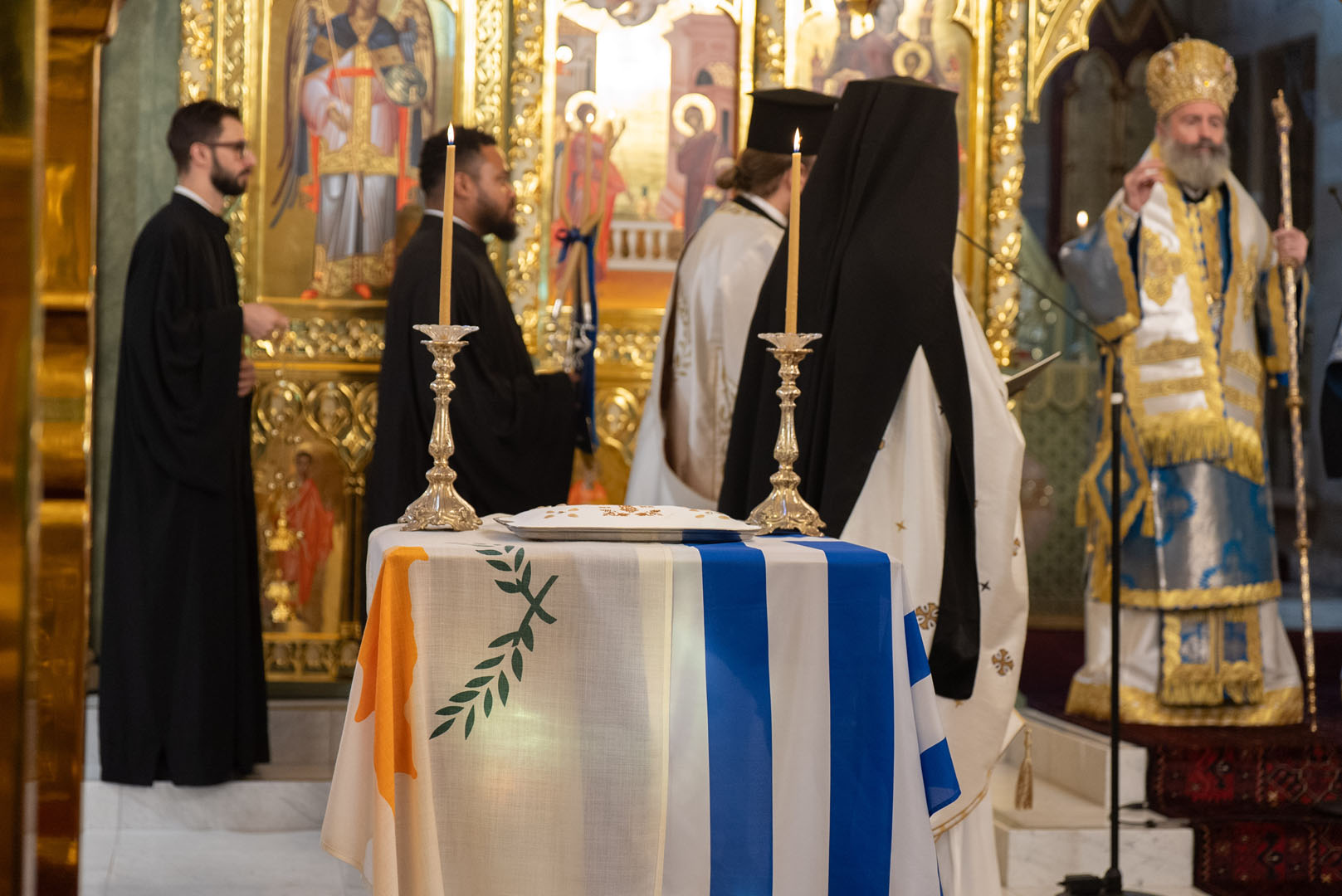 Προ της Απολύσεως, ο Αρχιεπίσκοπος κ. Μακάριος μίλησε για τις δύο εθνικές επετείους, της Ελλάδος και της Κύπρου, και ειδικότερα για τη Μεγαλόνησο σημείωσε: «Τιμούμε τους Κυπρίους αδελφούς μας, οι οποίοι αγωνίστηκαν για την απελευθέρωση του νησιού τους και δοξάζουμε τον Θεό για το γεγονός ότι υπάρχει ελεύθερη Κύπρος σήμερα». «Εκφράζουμε όμως και την παράκληση και την προσευχή», επεσήμανε, «ο Θεός να ευλογήσει και να βοηθήσει, ώστε το νησί ολόκληρο να απελευθερωθεί και να ενωθεί. Να μας δώσει ο Θεός αυτή τη μεγάλη ευλογία, με τη χάρη και την πρεσβεία της Παναγίας, της Προστάτιδος πάντοτε του Γένους μας, να δούμε την Κύπρο μας ελεύθερη και ενιαία».