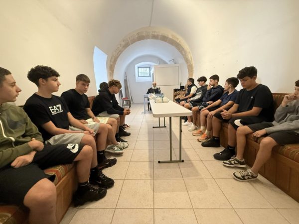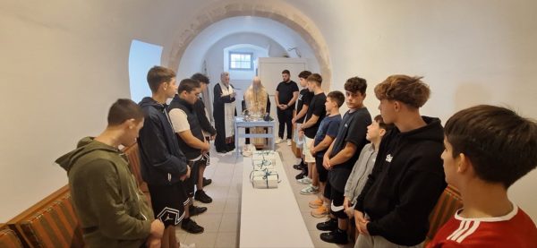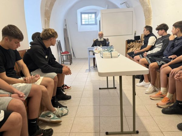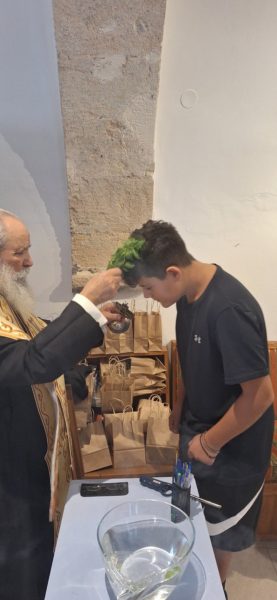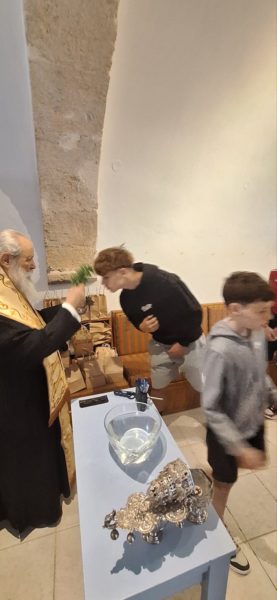 Μετά το κέρασμα στο Αρχονταρίκι ο Σεβασμιώτατος ετέλεσε στο κέντρο Νεότητος της Ιεράς Μητροπόλεως τον αγιασμό στην νεανική συντροφιά αγοριών Γυμνασίου και Λυκείου Ύδρας και ομίλησε κατάλληλα στα παιδιά ενώ τους προσέφερε ως ευλογία χρήσιμο δώρο.