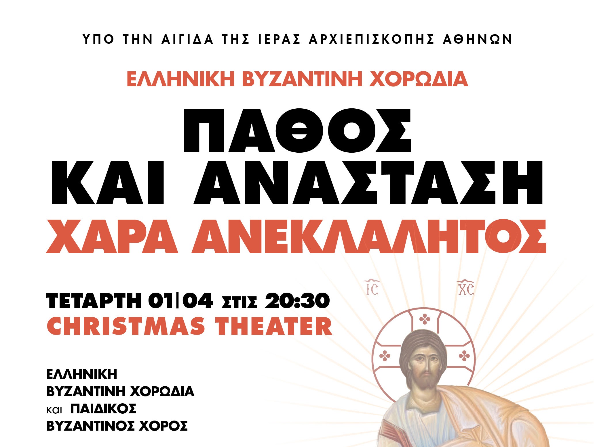Το Christmas Theater και η Ελληνική Βυζαντινή Χορωδία διοργανώνουν μια ξεχωριστή μουσικοπνευματική εκδήλωση με τίτλο «Πάθος και Ανάσταση, Χαρά Ανεκλάλητος» υπό την αιγίδα της Ιεράς Αρχιεπισκοπής Αθηνών την Τετάρτη 1 Απριλίου 2026, στο Christmas Theater.