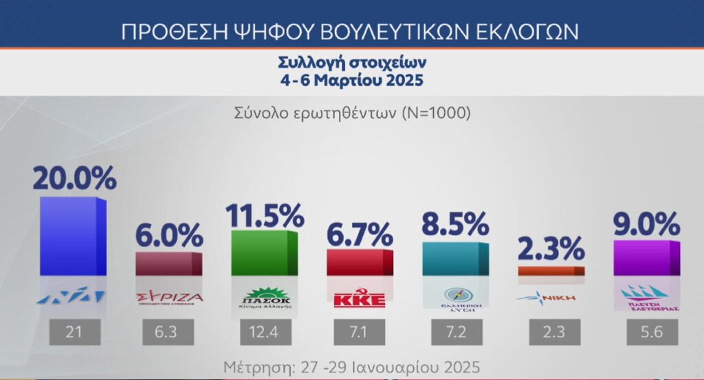 Σύμφωνα με πρόσφατη δημοσκόπηση της MRB, η τραγωδία των Τεμπών έχει προκαλέσει σημαντικές ανακατατάξεις στο πολιτικό σκηνικό. Η Νέα Δημοκρατία (ΝΔ) καταγράφει πτώση, με την πρόθεση ψήφου να βρίσκεται στο 20% και την εκτίμηση ψήφου στο 26,7%. Το ΠΑΣΟΚ ακολουθεί με 11,5% στην πρόθεση ψήφου και 15,4% στην εκτίμηση ψήφου. Εντυπωσιακή είναι η άνοδος της Πλεύσης Ελευθερίας, η οποία αναδεικνύεται τρίτη δύναμη με 9% στην πρόθεση ψήφου και 12% στην εκτίμηση ψήφου.