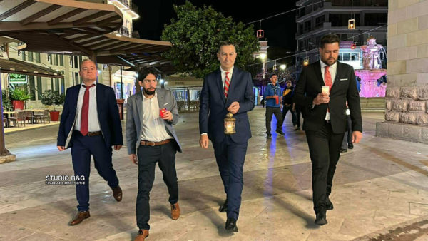 Το Άγιο Φως μεταφέρθηκε οδικώς από το αεροδρόμιο της Αθήνας προς το Ναύπλιο από τους Δημήτρη Καμπούρη και Γιώργο Κουτσογιάννη.