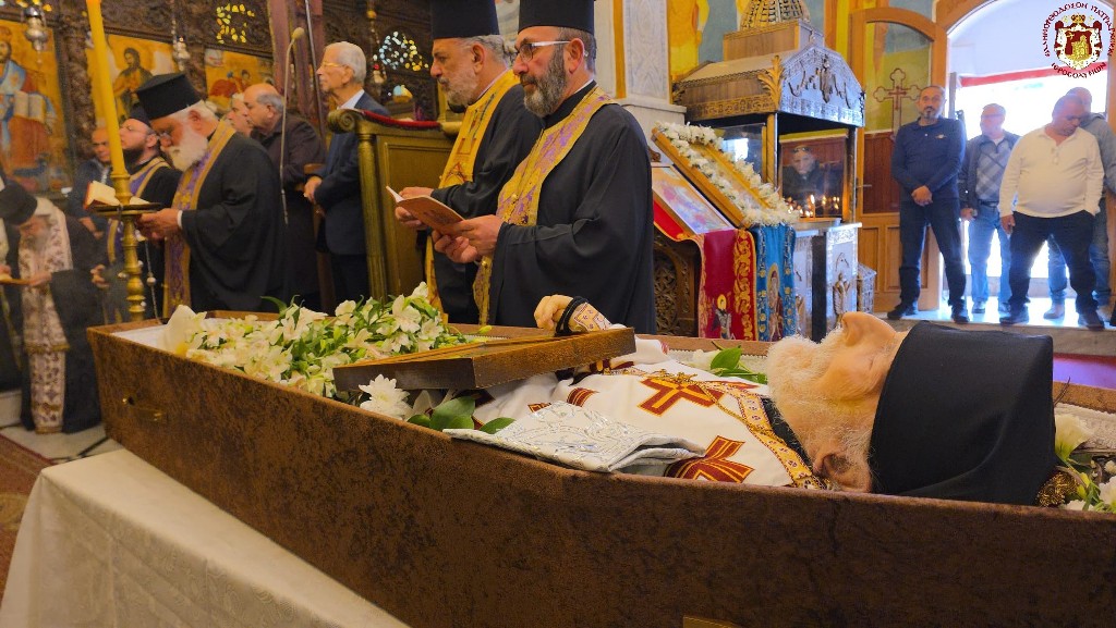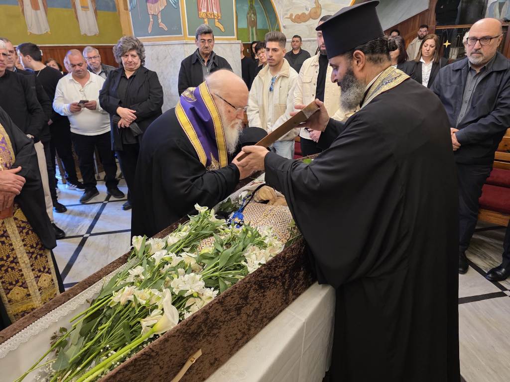 Προπέμποντες τόν προσφιλῆ ἀδελφόν ἡμῶν εἰς τήν τελευταίαν αὐτοῦ ἐπίγειον κατοικίαν καί τήν μόνιμον, ἀσάλευτον καί αἰώνιον πρός τούς οὐρανούς, παρακαλοῦμεν τόν ἐξουσίαν ἔχοντα δεσμεῖν καί λύειν ἁμαρτίας καί καταργήσαντα τό κράτος τοῦ θανάτου Κύριον ἡμῶν Ἰησοῦν Χριστόν, ὅπως ἐπίδῃ ἱλέῳ ὄμματι Αὐτοῦ ἐπί τόν δοῦλον Αὐτοῦ καί πιστῶς διακονήσαντα Αὐτόν ἱερατικῶς καί παρίδῃ εἴτι ὡς ἄνθρωπος ἥμαρτεν ἑκουσίως ἤ ἀκουσίως καί κατατάξῃ αὐτόν ἐν Παραδείσῳ, ἀξιούμενον τῆς ἀπολαύσεως τοῦ ἀϊδίου παραμυθητικοῦ φωτός τῆς τρισηλίου Θεότητος.