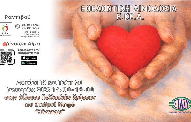 Με το ξεκίνημα της νέας χρονιάς, το Εθνικό Κέντρο Αιμοδοσίας (ΕΚΕΑ) και η ΣΤΑΣΥ Α.Ε. ενώνουν τις δυνάμεις τους και προσκαλούν τους πολίτες για μια στάση ζωής στην καρδιά της πόλης: διήμερη αιμοδοσία στις 19 και 20 Ιανουαρίου, από 14:00 έως 19:00, στην αίθουσα του Μετρό Συντάγματος.