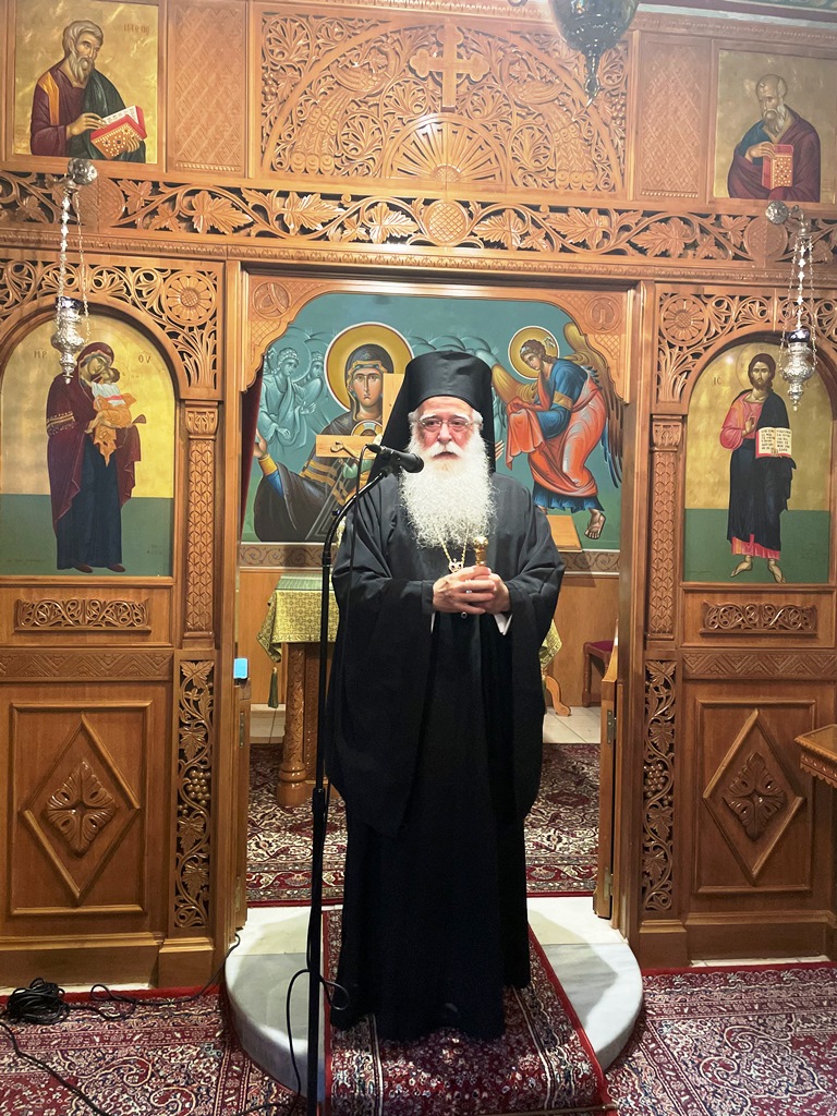 Στη σύντομη ομιλία του, ο Σεβασμιώτατος εξέφρασε τη χαρά του που βρέθηκε ξανά ανάμεσα τους, τονίζοντας ότι «είναι ένας χώρος ζωντανός, ένας χώρος λόγου του Θεού, προσευχής και λατρείας. Ευχαριστώ ιδιαιτέρως τον πατέρα Χαρίλαο, τον οποίον αγαπώ και εκτιμώ για το έργο που επιτελεί» και ευχήθηκε σε όλους δύναμη και ευλογία. Αναφερόμενος στο θέμα της φετινής συνάντησης, που αφορούσε την ερμηνεία της Αποκαλύψεως του Ιωάννου, σημείωσε ότι πρόκειται για «ένα από τα πιο δύσκολα, αλλά και σπουδαιότερα βιβλία της Καινής Διαθήκης. Η Αποκάλυψη δεν είναι βιβλίο καταστροφών, όπως συχνά νομίζουμε· είναι το βιβλίο της ελπίδας, το βιβλίο των εσχάτων με την έννοια της νίκης του καλού, δηλαδή της νίκης του Χριστού. Στην Παλαιά Διαθήκη ο Κύριος έρχεται, στην Καινή Διαθήκη ήρθε, και στην Αποκάλυψη έρχεται πάλι. Ο Χριστός έρχεται, όχι ο Αντίχριστος. Ο Αντίχριστος είναι γεγονός που θα καταργηθεί από τον Χριστό που έρχεται. Δυστυχώς πολλές φορές ασχολούμαστε περισσότερο με τον Αντίχριστο και ξεχνάμε τον Χριστό· αυτό θέλει πολλή προσοχή, γιατί δεν προέρχεται από την ορθόδοξη εμπειρία, αλλά από δυτικές αντιλήψεις».